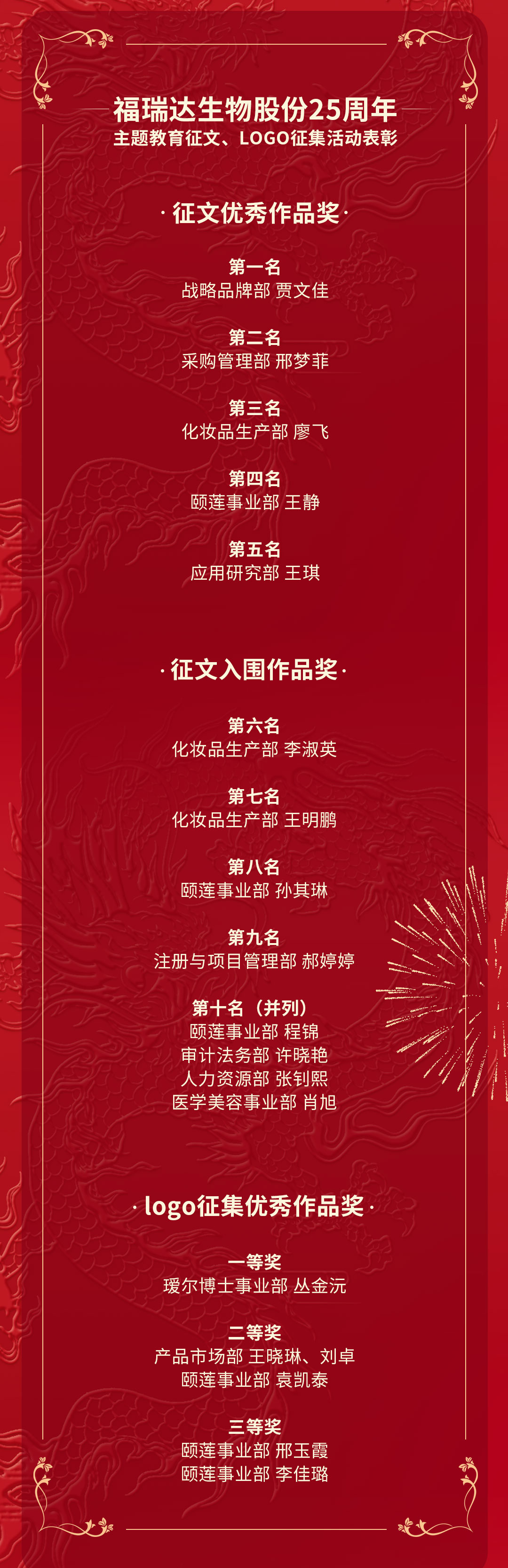 2023年值福瑞達(dá)生物股份成立25周年之際,戰(zhàn)略品牌部聯(lián)合黨支部、人力資源部開(kāi)展了主題教育征文、LOGO征集系列活動(dòng)。本次活動(dòng)自2023年7月開(kāi)始,各部門(mén)員工熱情參與,帶來(lái)諸多原創(chuàng)新勢(shì)力。經(jīng)專業(yè)評(píng)委會(huì)評(píng)審評(píng)定,最終福瑞達(dá)生物股份25周年主題教育征文活動(dòng)評(píng)出5份優(yōu)秀作品獎(jiǎng)、5份入圍作品獎(jiǎng),LOGO征集活動(dòng)評(píng)出6份優(yōu)秀作品獎(jiǎng)。會(huì)上,對(duì)本次活動(dòng)的獲獎(jiǎng)?wù)哌M(jìn)行了表彰。